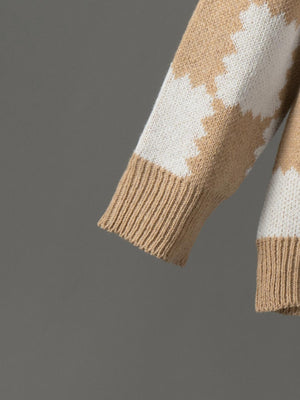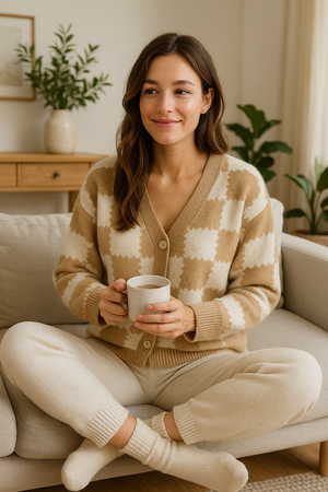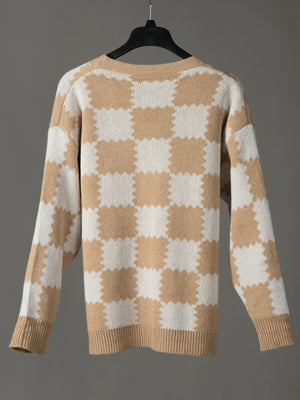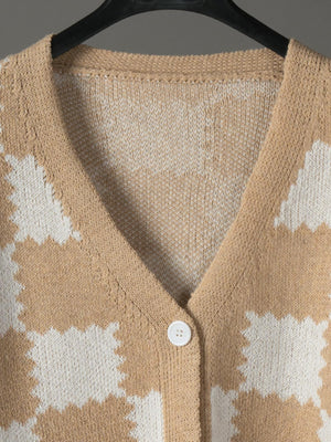 Chaqueta de Punto V - Estampado de Tablero de Ajedrez en Tonos Neutros