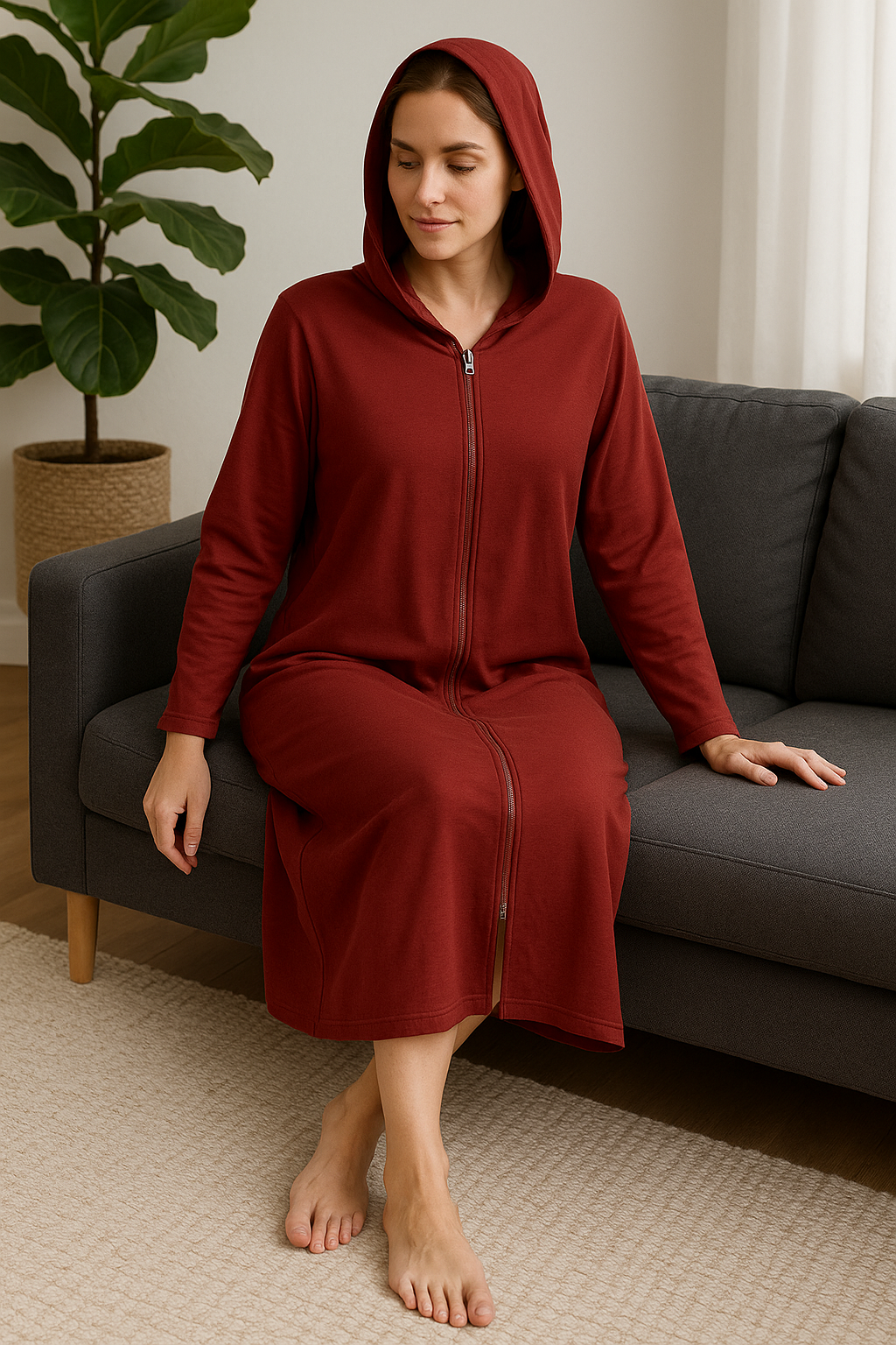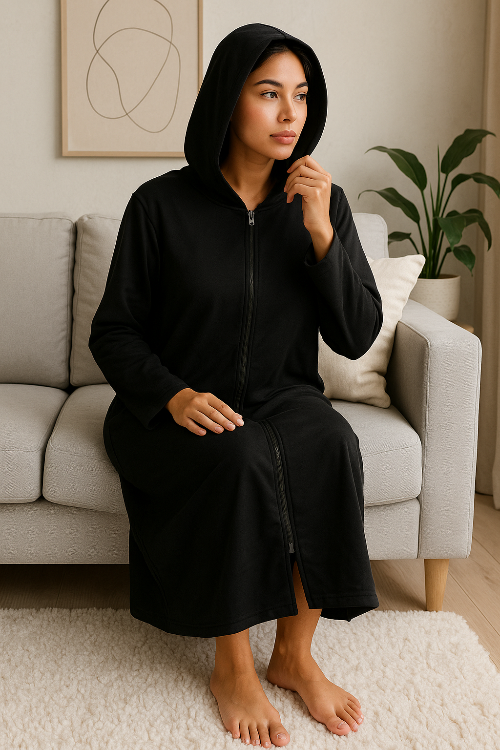 Hecha con un tejido suave y respirable que abraza tu piel con delicadeza, su diseño de capucha y cremallera completa te permite ajustar la cobertura según tus necesidades. La longitud larga y el corte amplio garantizan libertad de movimiento sin renunciar a la elegancia —perfecta para leer un libro en el sofá, preparar el desayuno o descansar tranquilamente.