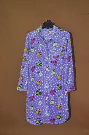 Sumérgete en el confort con este pijama de felpa morado, adornado con gatos coloridos que le dan un toque divertido y único. Perfecto para esas tardes de descanso en casa, donde calidez y estilo van de la mano.